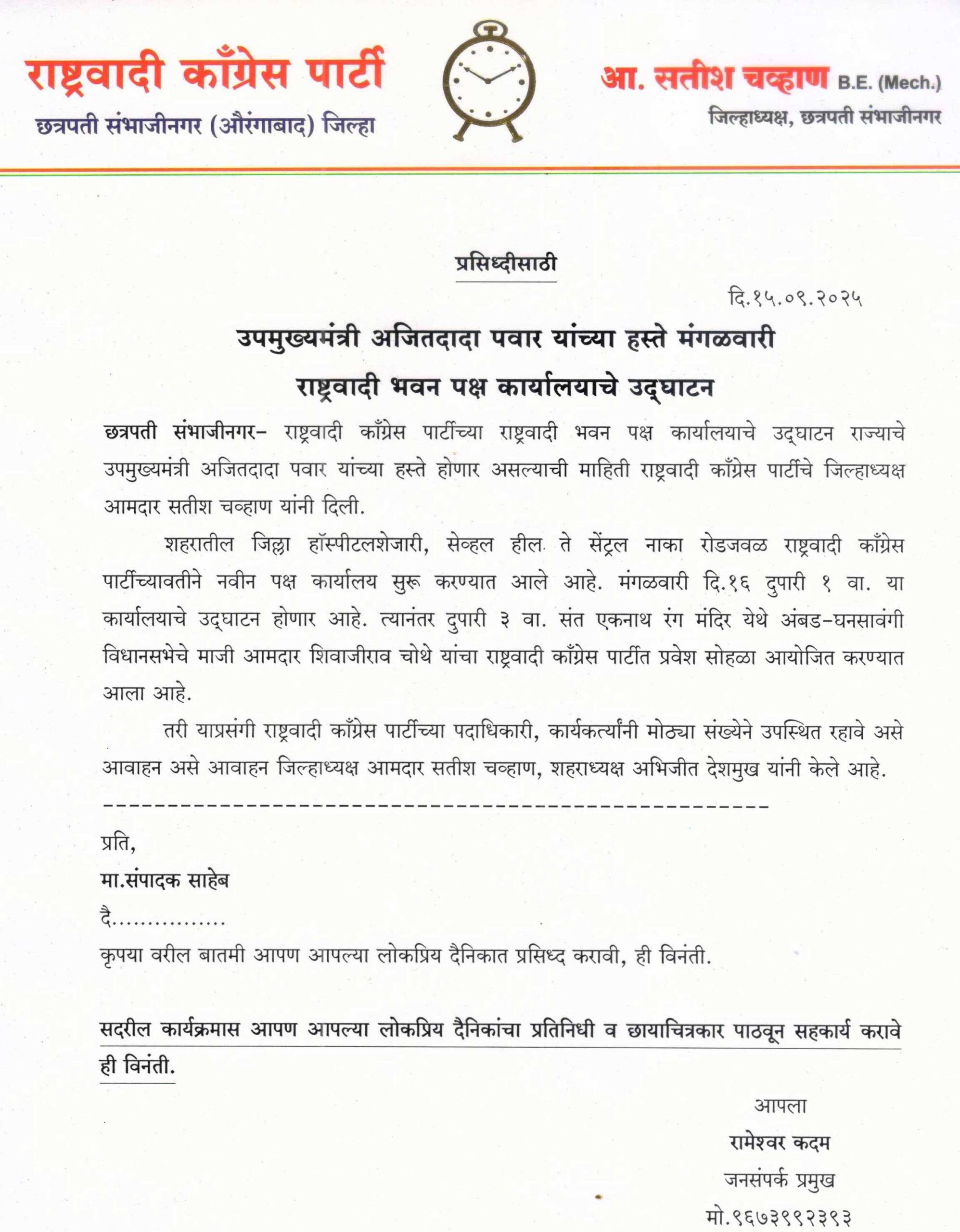 तरी याप्रसंगी राष्ट्रवादी काँग्रेस पार्टीच्या पदाधिकारी, कार्यकर्त्यांनी मोठ्या संख्येने उपस्थित रहावे असे आवाहन असे आवाहन जिल्हाध्यक्ष आमदार सतीश चव्हाण, शहराध्यक्ष अभिजीत देशमुख यांनी केले आहे.