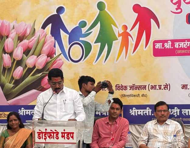 यावेळी तहसीलदार गिड्डे, समाज कल्याण अधिकारी मेश्राम, गटविकास अधिकारी दिवाने, डॉ.थोरात, तालुका आरोग्य अधिकारी डॉ.गवळी, गटशिक्षणाधिकारी लक्ष्मण बेडसकर,अलिम्को संस्थेची सर्व टिम, ज्ञानेश्वर चौरे, शंकर जाधव, पिंटू ठोंबरे, बंडू चौधरी यांची उपस्थिती होती. शिबीरामध्ये दिव्यांगांना जयपुरी फुट, कृत्रिम हात, कॅलीपर, व्हिलचेअर, ट्रायसिकल, क्रचेस, वॉकींग स्टीक, ब्रेल किट, स्मार्ट फोन, श्रवणयंत्र या सह जेष्ठ नागरीका करीता बेल्ट, वॉकर, काठया, चष्मे, कृत्रिम दात, खुबड, कृत्रिम अवयव, कानाची मशिन, व्हिलचेअर कमोडसहीत, सिलीकॉन खोम तकीया, नीब्रेस, स्पायनल सपोर्ट, सरवायकल कॉलर या सह इतर साहित्य वाटप करण्यात येणार आहे. त्या अनुषंगाने पुर्व तपासणी शिबीर त्या-त्या तालुक्यातील पंचायतसमितीमध्ये आयोजित करण्यात येत आहे. दि.१८ जुलै रोजी केज येथे सदर शिबीराचे उद्घाटन खा.बजरंग सोनवणे यांच्या हस्ते झाले.