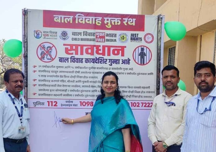 जालना/प्रतिनिधी/ जालना जिल्ह्यातून बालविवाहाची प्रथा समूळ नष्ट करण्यासाठी जिल्हा प्रशासनाने आता कंबर कसली आहे. जिल्हा महिला व बाल विकास कार्यालय आणि इंडियन सोशल वेलफेअर सोसायटी यांच्या संयुक्त पुढाकाराने तयार करण्यात आलेल्या **‘बालविवाह निर्मूलन चित्ररथा’**चा शुभारंभ आज जिल्हाधिकारी आशिमा मित्तल यांच्या हस्ते करण्यात आला. जिल्हाधिकारी कार्यालयाच्या प्रांगणात या रथाला हिरवी झेंडी दाखवून रवाना करण्यात आले.