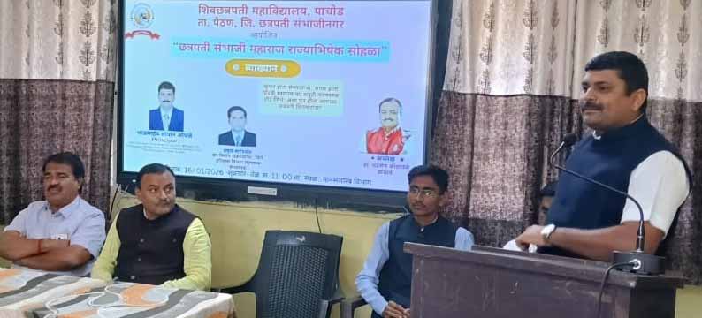 जालना/प्रतिनिधि/ छत्रपती संभाजी महाराज यांचा राज्याभिषेक दि.16 जानेवारी 1681 रोजी किल्ले रायगडावर संपन्न झाला.हा दिन केवळ इतिहासातील एक दिवस नसून,तो धैर्य,ज्ञान,राष्ट्रनिष्ठा आणि बलिदानाचा तेजस्वी संकल्प आहे असे गौरवोद्गार प्रा.नितीन चित्ते यांनी काढले.पाचोड येथील शिवछ्त्रपती महाविद्यालयात बुधभूषणकार छत्रपती संभाजी महाराज यांचा राज्याभिषेक दिनानिमित विशेष कार्यक्रमात प्रमुख पाहुणे म्हणून बोलत होते.यावेळी कार्यक्रमाच्या अध्यक्षस्थानी प्राचार्य डाॅ.चंद्रसेन कोठावळे होते.प्राचार्य डाॅ.भाऊसाहेब आंधळे आणि प्राचार्य डाॅ. बी.डी.मुंडे यांची विशेष उपस्थिती होती.प्रारंभी स्वराज्यनिर्माते छ्त्रपती शिवाजी महाराज आणि स्वराज्यरक्षक छत्रपती संभाजी महाराज यांच्या प्रतिमेस मान्यवरांच्या हस्ते पुष्पहार अर्पण करण्यात आला.यावेळी व्यासपीठावरील मान्यवरांचे शाल व पुष्पगुच्छ देऊन यथोचित सत्कार करण्यात आला.वयाच्या 23 व्या छत्रपती मुकुट धारण केलेल्या संभाजी महाराजांनी स्वराज्याची धुरा स्विकारताना राजसत्ता ही भोगासाठी नव्हे,तर जनतेच्या रक्षणासाठी व न्याय, स्वातंत्र्याच्या संरक्षणासाठीची पवित्र जबाबदारी मानली.एकूण 121 किल्ले जिंकणारे छत्रपती संभाजी राजे यांचे जीवन म्हणजे अन्यायाविरुद्ध उभे राहण्याची,आणि सत्यासाठी अखेरपर्यंत लढण्याची प्रेरणा आहे असे प्रतिपादन प्राचार्य डाॅ. चंद्रसेन कोठावळे यांनी केले.कार्यक्रमाचे प्रास्ताविक डाॅ. संतोष चव्हान यांनी केले. कार्यक्रमाचे सुत्रसंचालन उपप्राचार्य डाॅ.शिवाजी यादव यांनी तर उपस्थितीतांचे आभार डाॅ.गांधी बानायत यांनी मानले.कार्यक्रमास डाॅ.उत्तम जाधव,डाॅ.हरिप्रसाद बिडवे,डाॅ.सुरेश नलावडे,डाॅ.तुकाराम गावंडे,डाॅ.विठ्ठल देखने,प्रा.सचिन कदम,प्रा.संदीप सातोणकर,कर्मचारी व विद्यार्थी मोठ्या संख्येने उपस्थित होते.