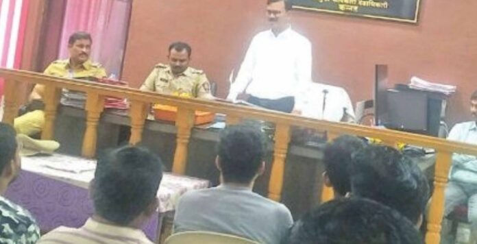 यावेळी उपविभागीय पोलीस अधिकारी श्री.धीरज चव्हाण,शहर पोलीस निरीक्षक श्री.रघुनाथ सानप,गणेश महासंघाचे अध्यक्ष श्री. साईनाथ आल्हाड,सहाय्यक पोलीस निरीक्षकश्री.कुणाल सूर्यवंशी,श्री.चांद मेंडके,महावितरण विभागाचे उप कार्यकारी अभियंता श्री.राठोड,या प्रमुख प्रशासकीय अधिकाऱ्यांची उपस्थिती होती.तर बैठकी दरम्यान मा.नगराध्यक्ष डॉ.सादाशिव पाटील,यांनी शहरातील मोकाट जनावरे,श्री.राजेंद्र गव्हाणे यांनी विधुत पुरवठ्या संभदी तर संदेश पवारांनी शहरातील स्वच्छते बाबत काही प्रश्नउपस्थित केले.त्यावर तहसीलदारांनी तात्काळ कार्यवाईचे आदेश संबंधीत यंत्रनेस दिल्या जाईल असे उपस्थितांना सूचित केले.या वेळी पो.नि.सनपांनी आपले विचार माडतांना उत्सव काळात कोन्हीही कायदा सुव्यवस्था हातात घेऊन विघ्न निर्माण करण्याचा प्रयत्न केल्यास पोलीस दलाच्या वतीने त्यांच्यावर कठोरातील कठोर कारवाई केली जाईल याची नोंद घ्यावी, असा इशाराही देण्यात आला आहे.यावेळी उपविभागीय पोलीस अधिकारी श्री.धीरज चव्हाण,गणेश महासंघाचे अध्यक्ष साईनाथ आल्हाड यांनीही आपले विचार प्रगट करून दोन्हीही सने आनंदाने व शांततेत साजरे करण्याचे आव्हान नागरिकांना केले आहे.या वेळी भाजपाचे मध्य मंडळ प्रमुख राम पवार,प्रकाश कचोळे, सिद्धार्थ निकाळजे विकास बागुल या सह पोलीस दल,तहसील,नगरपरिषद कार्यालयाचे अनेक कर्मचारी वर्ग शहरातील समाजसेवक प्रतिष्ठित नागरिक मोठ्या संख्येने उपस्थित होते.