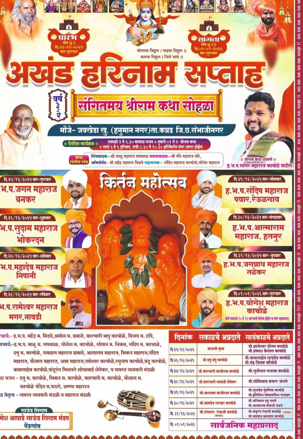 कन्नड/प्रतिनिधी/ कन्नड तालुक्यातील जवखेडा खुर्द हनुमान नगर.येथील हनुमान मंदिर येथे दि.२५ ते १ जानेवारी रोजी अखंड हरीनाम सप्ताह व श्रीराम कथा सप्ताहाचे आयोजन करण्यात आले आहे.धार्मिक, उत्साह, भक्तिभाव व गावातील एकत्रित पुढाकार यामुळे या आठवडाभर चालणाऱ्या सोहळ्याला विशेष महत्त्व प्राप्त झाले आहे.या श्रीराम कथा सप्ताहाचा पंच क्रोशितील भाविकांनी लाभ घेण्याचे आवाहन जवखेडा खुर्द. येथील हरिभक्त मिञ मंडळ व ग्रामस्थांनी केले आहे.आठवडाभर चालणारा श्रीराम कथेनिमित्त दैनंदिन कार्यक्रमांतर्गत सकाळी ४ते ६:३० काकडा,  कथा, दुपारी १ ते ४ विश्रांती, सायंकाळी ५ ते ६ हरीपाठ, राञी ८ ते १०ʼ३० हरीकिर्तन, जागर होईल.