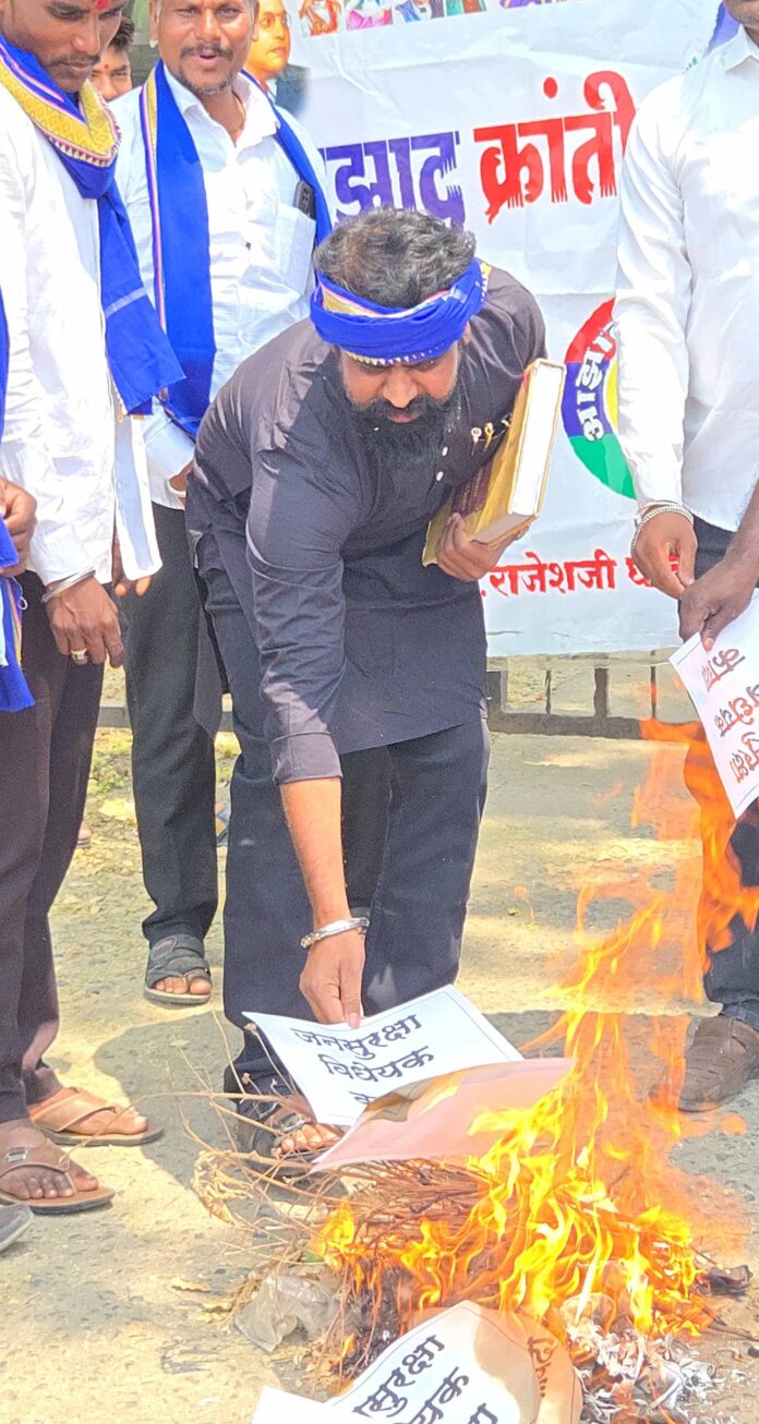 माजलगाव /प्रतिनिधी /शेख हमीद/ दिनांक २९ मार्च २०२५ रोजी आझाद क्रांती सेनेच्या वतीने तहसीलदार मार्फत श्री. जितेंद्र भोळे, सचिव (१) (कार्यभार),महाराष्ट्र विधानमंडळ सचिवालय,विधान भवन, बॅकबे रेक्लमेशन,मुंबई यांच्याकडे मागणी करण्यात आली आहे माजलगाव तहसील कार्यालयाच्या समोर तीव्र निदर्शने करून जनक सुरक्षा विधेयक कायद्याची होळी करण्यात आली