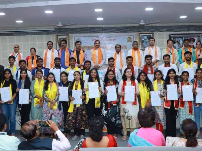छत्रपती संभाजीनगर – म.शि.प्र. मंडळ संचालित देवगिरी महाविद्यालय छत्रपती संभाजीनगर डॉ. बाबासाहेब आंबेडकर मराठवाडा विद्यापीठ यांच्या संयुक्त विद्यमाने देवगिरी महाविद्यालयात शैक्षणिक वर्ष 2023-24 पदवी प्रमाणपत्र वितरण समारंभाचे आयोजन दिनांक 24 एप्रिल 2025 रोजी करण्यात आले. या पदवी वितरण समारंभासाठी प्रमुख पाहुणे म्हणून मा. जिल्हाधिकारी तथा जिल्हा दंडाधिकारी श्री.दिलीप स्वामी उपस्थित होते. कार्यक्रमाचे अध्यक्षस्थानी देवगिरी महाविद्यालय विकास समितीचे ज्येष्ठ सदस्य श्री पंडितराव हर्षे होते. तर विचारमंचावर म.शि.प्र. मंडळ केंद्रीय कार्यकारिणी सदस्य श्री. त्रिंबकराव पाथ्रीकर, महाविद्यालय विकास समिती सदस्य, डॉ. आदित्य येळीकर, निमंत्रित सदस्य श्री. विवेक जैस्वाल, महाविद्यालयाचे प्राचार्य डॉ. अशोक तेजनकर, उपप्राचार्य डॉ.रवी पाटील, डॉ.अपर्णा तावरे, डॉ. गणेश मोहिते या कार्यक्रमाचे समन्वयक डॉ. शेखर शिरसाट यांची प्रमुख उपस्थिती होती. पदवी वितरण समारंभाच्या आरंभी या कार्यक्रमाचे प्रास्ताविक प्राचार्य डॉ.अशोक तेजनकर यांनी केले. आपल्या प्रास्ताविकपर भाषणात त्यांनी विद्यार्थ्यांचा सर्वांगीण विकासामध्ये देवगिरी महाविद्यालयाची भूमिका विशद केली. तसेच देवगिरी महाविद्यालय हे डॉ.बाबासाहेब आंबेडकर मराठवाडा विद्यापीठाच्या कार्यक्षेत्रातील पहिले स्वायत्त दर्जा असणारे महाविद्यालय आहे. या स्वायत्त दर्जाच्या माध्यमातून देवगिरी महाविद्यालयामध्ये रोजगाराभिमुख, संशोधन व विकासपुरक अभ्यासक्रम राबविले जातात असे विचार मांडले.