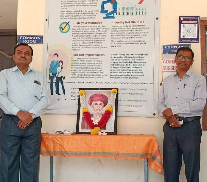 पाचोड :- येथील शिवछत्रपती कला, वाणिज्य व विज्ञान महाविद्यालयाच्या मराठी विभागाच्या वतीने क्रांतिसूर्य महात्मा ज्योतिबा फुले यांची जयंती उत्साहात साजरी करण्यात आली. या कार्यक्रमाला प्रमुख मार्गदर्शक म्हणून डॉ. गांधी बानायत उपस्थित होते, तर अध्यक्षस्थानी महाविद्यालयाचे प्राचार्य डॉ. चंद्रसेन कोठावळे होते.कार्यक्रमात मार्गदर्शन करताना डॉ. गांधी बानायत यांनी महात्मा फुले यांच्या कार्याचा आढावा घेतला. त्यांनी सांगितले की, मुलींसाठीची पहिली शाळा तसेच अस्पृश्यांसाठीची पहिली शाळा सुरू करून फुले यांनी शिक्षणाचा प्रसार केला. तसेच सत्यशोधक समाजाची स्थापना करून त्यांनी समाजात विज्ञाननिष्ठ विचार रुजवले. ‘गुलामगिरी’ या ग्रंथाच्या माध्यमातून सर्वसामान्यांमध्ये जागृती निर्माण केली, तर ‘शेतकऱ्यांचा आसूड’ या ग्रंथातून शेतकऱ्यांच्या समस्या समाजासमोर मांडल्या.