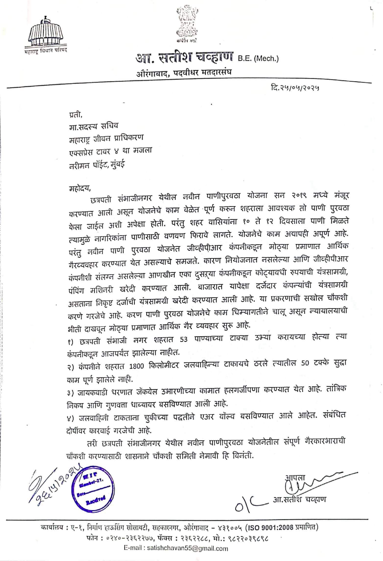 नवीन पाणी पुरवठा योजनेच्या आर्थिक गैरकारभारासंदर्भात आमदार सतीश चव्हाण यांनी आज (दि.26) महाराष्ट्र जीवन प्राधिकरणाच्या सदस्य सचिवांना दिलेल्या निवेदनात म्हटले आहे की, छत्रपती संभाजीनगर येथील नवीन पाणीपुरवठा योजना सन 2019 मध्ये मंजूर करण्यात आली असून काम वेळेत पूर्ण करून शहराला आवश्यक तो पाणी पुरवठा केला जाईल अशी अपेक्षा होती. मात्र शहर वासियांना 10 ते 12 दिवसाला पाणी मिळते. परिणामी शहरातील नागरिकांना पाण्यासाठी वणवण फिरावे लागते. योजनेचे काम अद्यापही अपूर्ण आहे. नवीन पाणी पुरवठा योजनेत जीव्हीपीआर कंपनीकडून मोठ्या प्रमाणात आर्थिक गैरव्यवहार करण्यात येत असल्याच्या तक्रारी माझ्याकडे येत आहेत. नियोजनात नसलेल्या आणि जीव्हीपीआर कंपनीशी संलग्न असलेल्या आणखीन एका दुसर्‍या कंपनीकडून कोट्यावधी रूपयांची यंत्रसामग्री, पंपिंग मशिनरी खरेदी करण्यात आली. बाजारात यापेक्षा दर्जेदार कंपन्यांची यंत्रसामग्री असताना निकृष्ट दर्जाची यंत्रसामग्री खरेदी करण्यात आली असल्याचे आमदार सतीश चव्हाण यांनी निवदेनात म्हटले आहे.