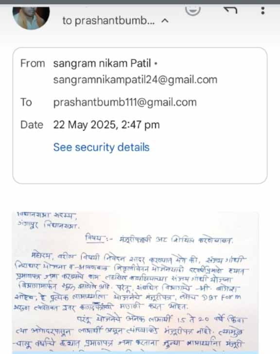 गंगापूर/ प्रतिनिधी/श्रावणबाळ संजय गांधी निराधार योजनेच्या लाभार्थ्यांकडून मंजुरी पत्र मागण्याची अट रद्द करावी संग्राम कैलास निकम पाटील यांनी आमदार प्रशांत बंब यांच्याकडे मेलद्वारे व व्हाट्सअप द्वारे निवेदन पाठवून मागणी केली आहे. शिवसेना दिव्यांग (अपंग) सहाय्यक सेना संग्राम कैलास निकम पाटील गंगापूर तालुका संघटक यांनी अशी मागणी केली आहे की. गंगापूर तहसील कार्यालयात दिव्यांग बांधवांना दर वर्षी प्रमाणे हयात पत्र देण्यात येते ते आता सुरू झाले आहे. परंतु आता हयात पत्र देण्यासाठी संजय गांधी निराधार योजना विभागातील अधिकारी मंजुरी पत्राची मागणी करत आहे. परंतु काही दिव्यांग यांच्याकडे मागील १५ ते २० वर्षापासून संजय गांधी निराधार व श्रावण बाळ निवृत्ती वेतन योजनेचा लाभ घेत आहे. त्यांना आज रोजी हयात पत्र संजय गांधी विभागात जमा करण्यासाठी अधिकाऱ्याकडून मंजुरी पत्राची मागणी केली जात आहे. परंतु पंधरा ते वीस वर्षापासून जे लाभार्थी लाभ घेत आहे. त्यांच्याकडे सदर मंजुरी पत्र उपलब्ध नसल्यामुळे अधिकारी त्यांची अडवणूक करत आहे. यामुळे संजय गांधी निराधार योजनेच्या लाभार्थ्यांना योजनेच्या लाभांपासून वंचित राहण्याची शक्यता नाकारता येत नाही. तरी माननीय प्रशांत बंब साहेब यांनी मागणी करण्यात आलेल्या पत्राची तात्काळ दखल घेऊन संबंधित अधिकाऱ्यांना मागील १५ ते २० वर्षांपूर्वीचे लाभार्थी यांच्याकडून मंजुरी पत्र मागण्याची अट रद्द करण्यात यावी अशी मागणी संग्राम कैलास निकम पाटील यांनी केली आहे ,