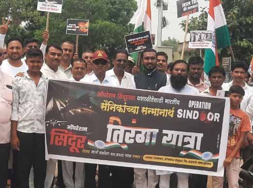 सोयगाव/ प्रतिनिधी / भारतीय सैनिकांचे मनोबल उंचावण्यासाठी आज सोयगाव शहरात तिरंगा यात्रेचे आयोजन करण्यात आले होते. ही तिरंगा यात्रा श्री विठ्ठल मंदिरा पासून सुरू होऊन आमखेडा , विश्वरत्न डॉ. बाबासाहेब आंबेडकर यांच्या पुर्ण आकृती पुतळ्याला पुष्पहार अर्पण करून डॉ . बाबासाहेब आंबेडकर चौक, वाल्मिक नगर, छत्रपती शिवाजी महाराज चौक , बस स्थानक मार्ग श्री विठ्ठल मंदिर येथे संपन्न झाली. यावेळी माजी सैनिकांचा सन्मान करण्यात आला प्रास्ताविक संजय पाटील यांनी केले तर सूत्रसंचालन राहुल राठोड यांनी केले.