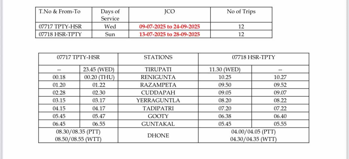 गाडी क्र. 07717 तिरुपती ते हिसार हि विशेष गाडी तिरुपती येथून दिनांक 09.07.2025 ते 24.09.2025 दरम्यान दर बुधवारी रात्री 23.45 वाजता सुटेल आणि हिसार येथे शनिवारी दुपारी 14.05 वाजता पोहोचेल.