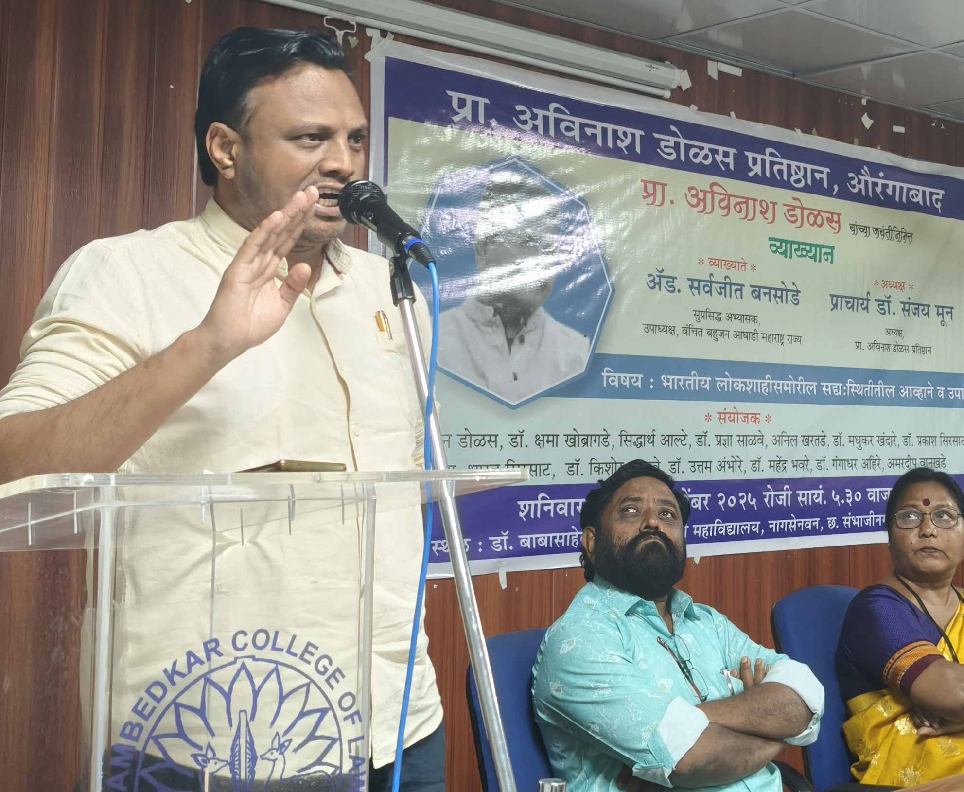 ते (दि. १३ डिसेंबर २०२५ ) स्थानिक डॉ. बाबासाहेब आंबेडकर विधी महाविद्यालय, नागसेनवन, छ. संभाजीनगर (औरंगाबाद) येथे प्रा. अविनाश डोळस प्रतिष्ठान, औरंगाबाद यांच्या वतीने प्रा. अविनाश डोळस यांच्या जयंतीनिमित्त “भारतीय लोकशाहीसमोरील सद्य:स्थितीतील आव्हाने व उपाय” या विषयावर आयोजित व्याख्यानाच्या कार्यक्रमातुन बोलत होते.