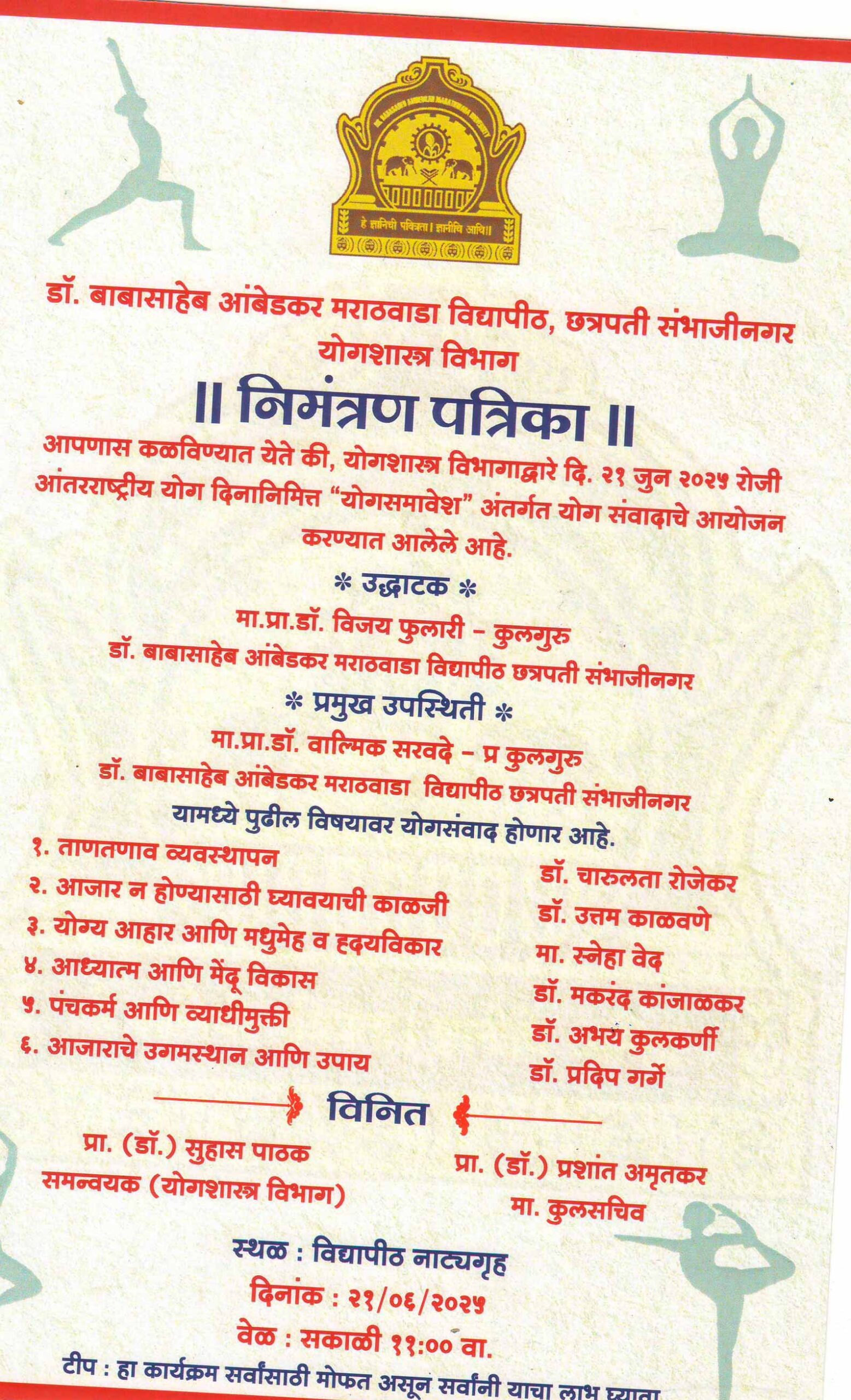 छत्रपती संभाजीनगर/प्रतिनिधी/ आयुष मंत्रालय, भारत सरकारच्या निर्देशाने डॉ.बाबासाहेब आंबेडकर मराठवाडा विद्यापीठातंर्गत येत्या शनिवारी (दि.२१) रोजी सकाळी ११ वाजता आंतरराष्ट्रीय योग दिवस साजरा करण्यात येणार आहे. विद्यापीठाच्या मुख्य नाटयगृहामध्ये संपन्न होणाऱ्या ’योग संवाद’ या कार्यक्रमाचे उद्घाटन मा.कुलगुरु डॉ.विजय फुलारी करणार आहेत, अशी माहिती विभागाचे समन्यवक डॉ.सुहास पाठक यांनी दिली. कार्यक्रमाच्या प्रमुख उपस्थिती प्रकुलगुरु डॉ.वाल्मिक सरवदे हे असतील. तरुण वर्गामध्ये वाढता ताणतणाव आणि त्यामुळे होणारे दुष्यपरिणाम याचा गाभिर्याने विचार करुन (दि.२१) रोजी सकाळी ११ वाजता सुरु होणा-या या कार्यक्रमामध्ये शहरातील नामांकित मान्यवर उपस्थित मान्यवर मार्गदर्शन करणार आहेत. यामध्ये डॉ.चारुलता रोजेकर (योगथेरपी सेंटर), डॉ.उत्तम काळवणे (भारतीय योग संस्थान), डॉ.स्नेहा वेद (प्रसिध्द आहार तज्ञ), डॉ.मकरंद कांजाळकर (मेंदू तज्ञ, माणिक हॉस्पिटल, छत्रपती संभाजीनगर), डॉ.अभय कुलकर्णी (वरद आयुर्वेद चिकित्सा केंद्र, छत्रपती संभाजीनगर), डॉ.प्रदिप गर्गे (होमिओपॅथी तज्ञ, छत्रपती संभाजीनगर व पूणे), आदी मान्यवर ताणतणाव, आजर न होण्यासाठी घ्यावयाची काळजी उदा. थायराँईड, वजन नियंत्रित द्वारा योग्य आहार, मधुमेह व हदयविकार – काळजी व उपाय, मान, पाठ, कंबर आणि विविध मणके व हाडांडे आजार आणि उपाय या विषयावर मार्गदर्शन करुन उपस्थितांशी संवाद साधणार आहेत.